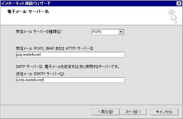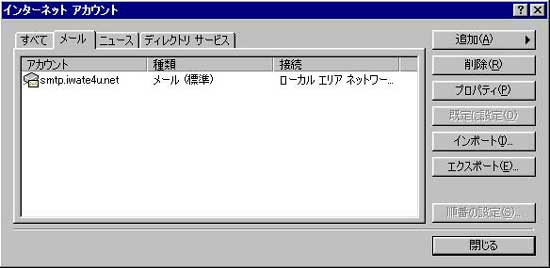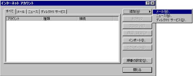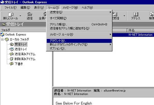 [ツール]メニュー から アカウントをクリック インターネットアカウントメニューが表示されます [追加]ボタンを押してメールを選択すると インターネット接続ウィザードが起動します 指示に従い [名前]→[メールアドレス]→[サーバー名]→[IDパスワード] を入力していきます